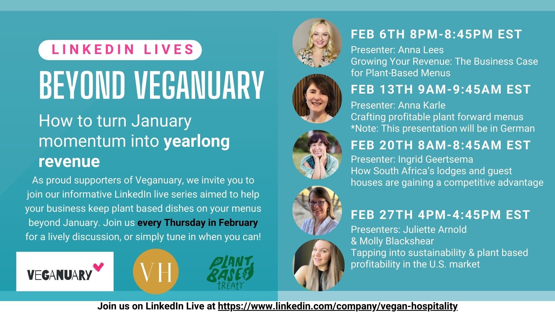 That’s exactly what we’re here to talk about at Vegan Hospitality’s upcoming LinkedIn Live event series, Beyond Veganuary: How to Turn January Momentum into Yearlong Revenue. With 5 expert consultants from 4 countries, we’re ready to help hospitality businesses leverage the success of Veganuary and make it a permanent fixture on their menus. These four LinkedIn Live events will dive into strategies tailored to your region, with advice from professionals who are deeply connected to the plant-based movement and have a wealth of experience turning trends into long-term successes.