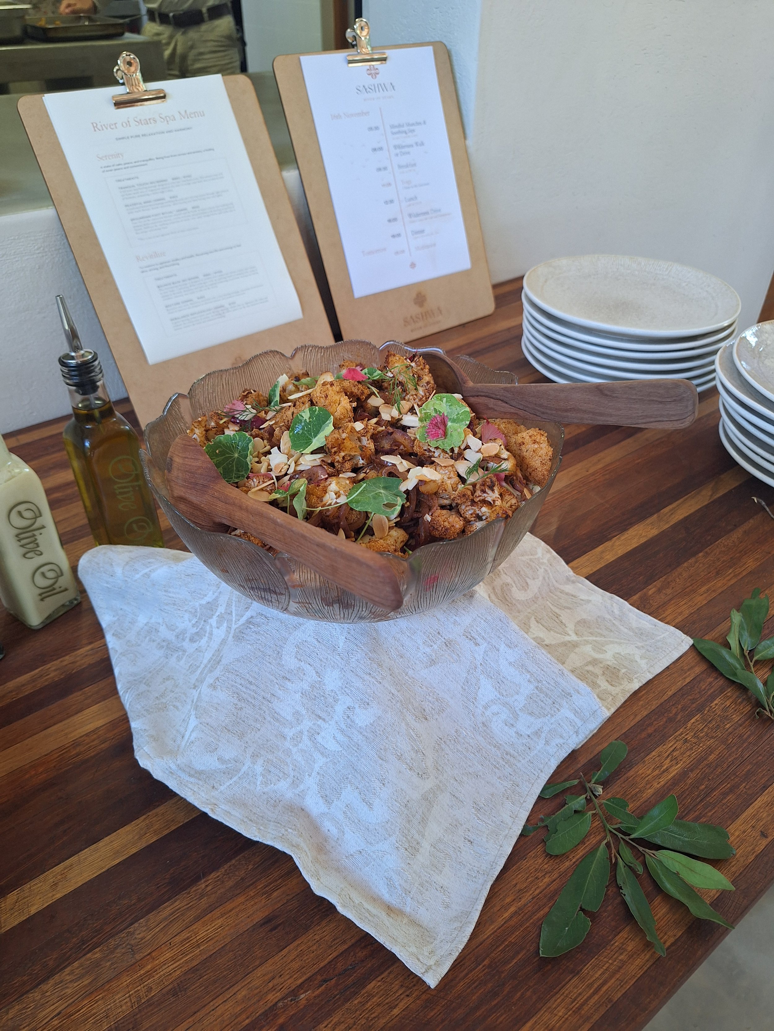 The dining experience at Sashwa was a true highlight. Meals were buffet-style, showcasing creative, plant-based dishes with a focus on minimizing food waste. Leftovers were repurposed into grab-and-go salads stored in glass jars, a brilliant and sustainable solution for guests needing a snack or missing a meal. The chefs’ pride in their craft was palpable, and the open kitchen allowed us to feel part of the process.