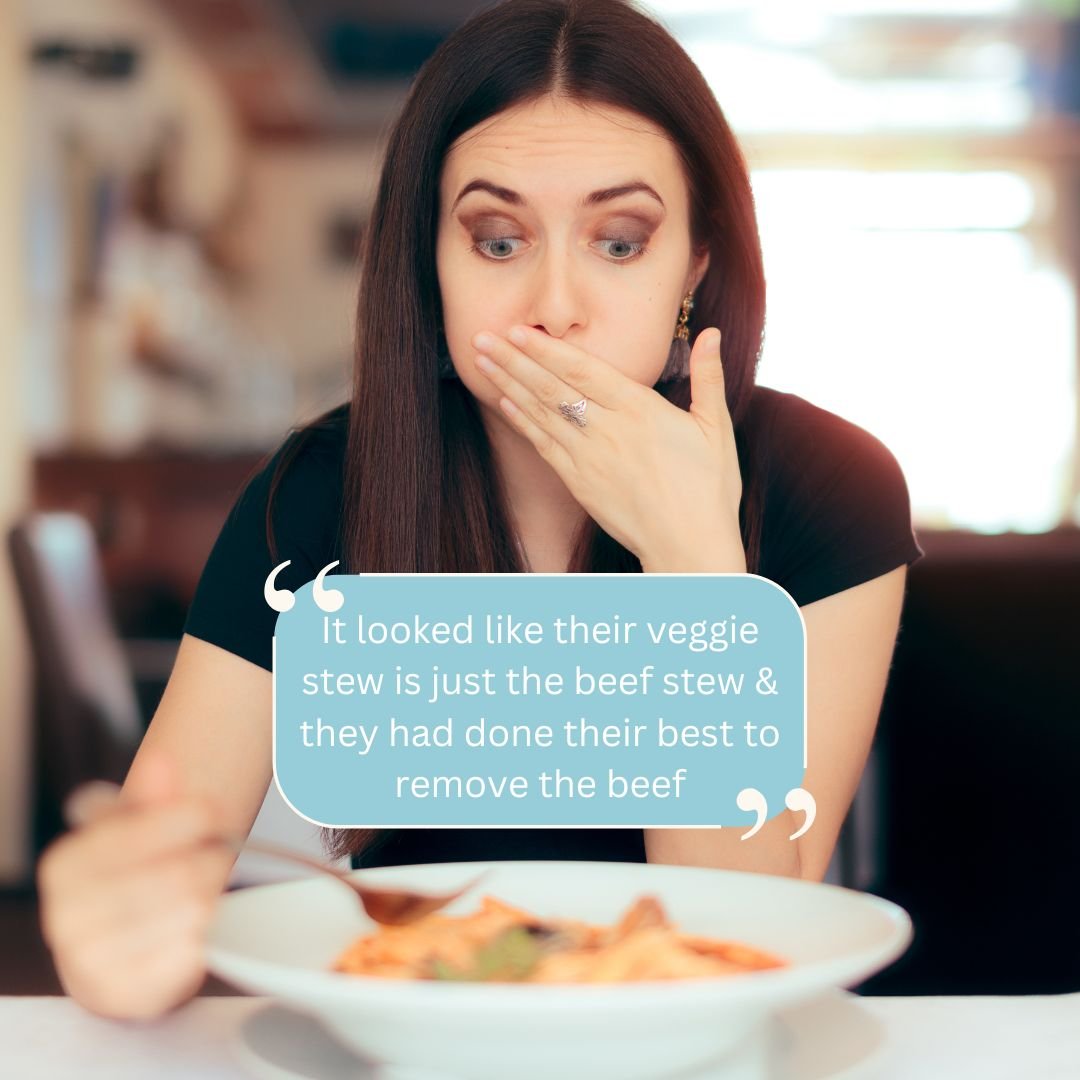 The whole story:''I was eating at a local Indian/Pakistani restaurant where they claimed to have an off-menu veggie stew that is vegan, and when I was eating it, I found a piece of beef, very traumatic for me. It looked like their veggie stew is just the beef stew & they had done their best to remove the beef - shocking! Due to this experience, I have never eaten at an Indian or Pakistani restaurant that didn't have clearly labelled vegan options.''