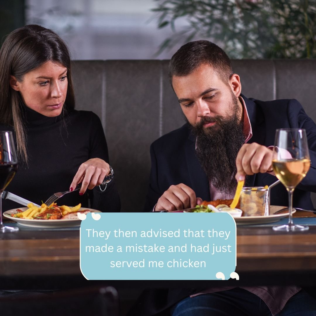 The whole story:''I was eating at a Mexican restaurant which is mainly vegetarian & they note on the menu that some dishes can be made vegan. I asked if the enchiladas could be made vegan, to which I was told that they would check, so instead I asked about the Fajitas but they weren't sure so I just asked them to bring me which even could be made vegan. I was then brough the enchiladas & while I was letting them cool down (luckily) they came with Fajitas too, to which I replied that I only ordered one dish & they then advised that they made a mistake & had just served me chicken.''