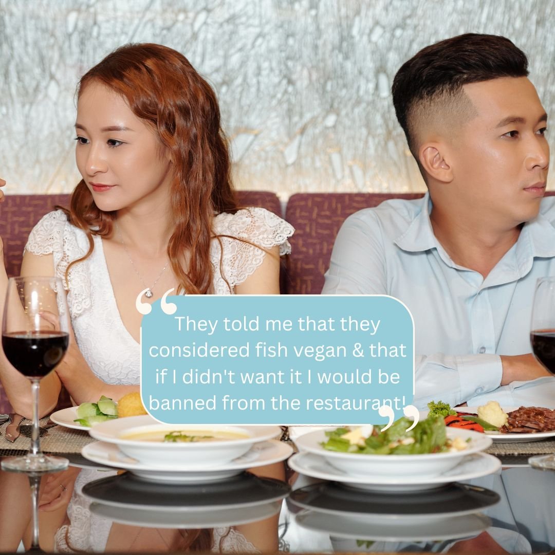 The whole story: ''I ordered a salad & it arrived with tuna in. I explained that I couldn't eat it & had ordered a vegan salad, they told me that they considered fish vegan & that if I didn't want it I would be banned from the restaurant!''