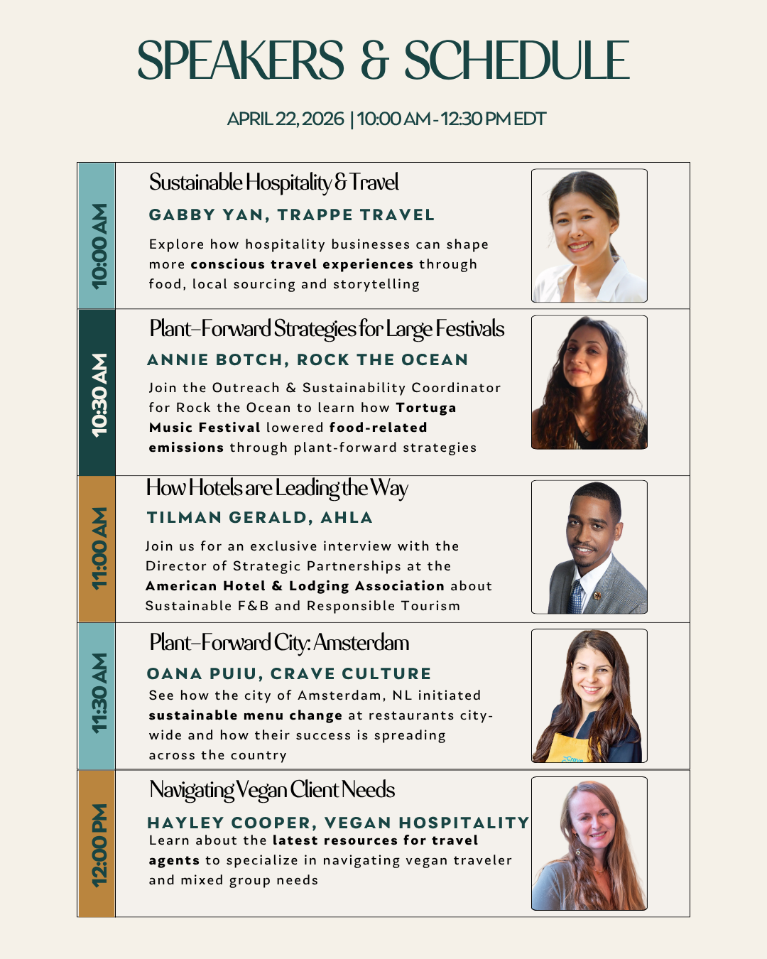 Whether you're a hotel executive looking to reduce environmental impact, a restaurant manager aiming to boost guest satisfaction, or a travel agent seeking to serve conscious travelers, this conference will show you exactly how plant-forward F&B strategies can transform your business results.